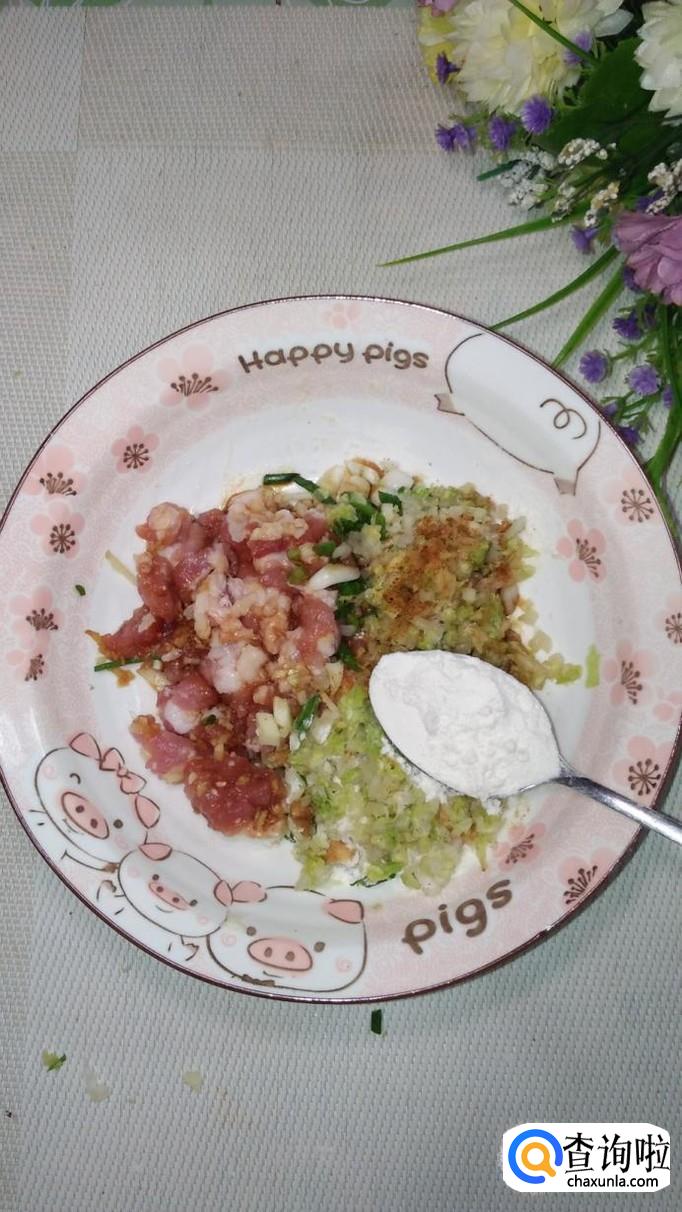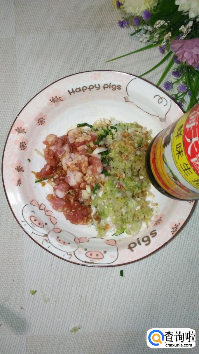 准备适量葱,姜,蒜,将葱,姜蒜,切好后放入盘中,然后加入适量盐,鸡精,五香粉,开始拌馅儿。