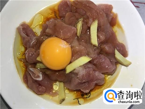 把姜片、鸡蛋加入瘦肉中,再加入适量的花生油、酱油、盐。