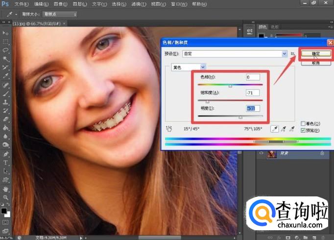 根据实际效果调整“饱和度”、“明度”的参数;