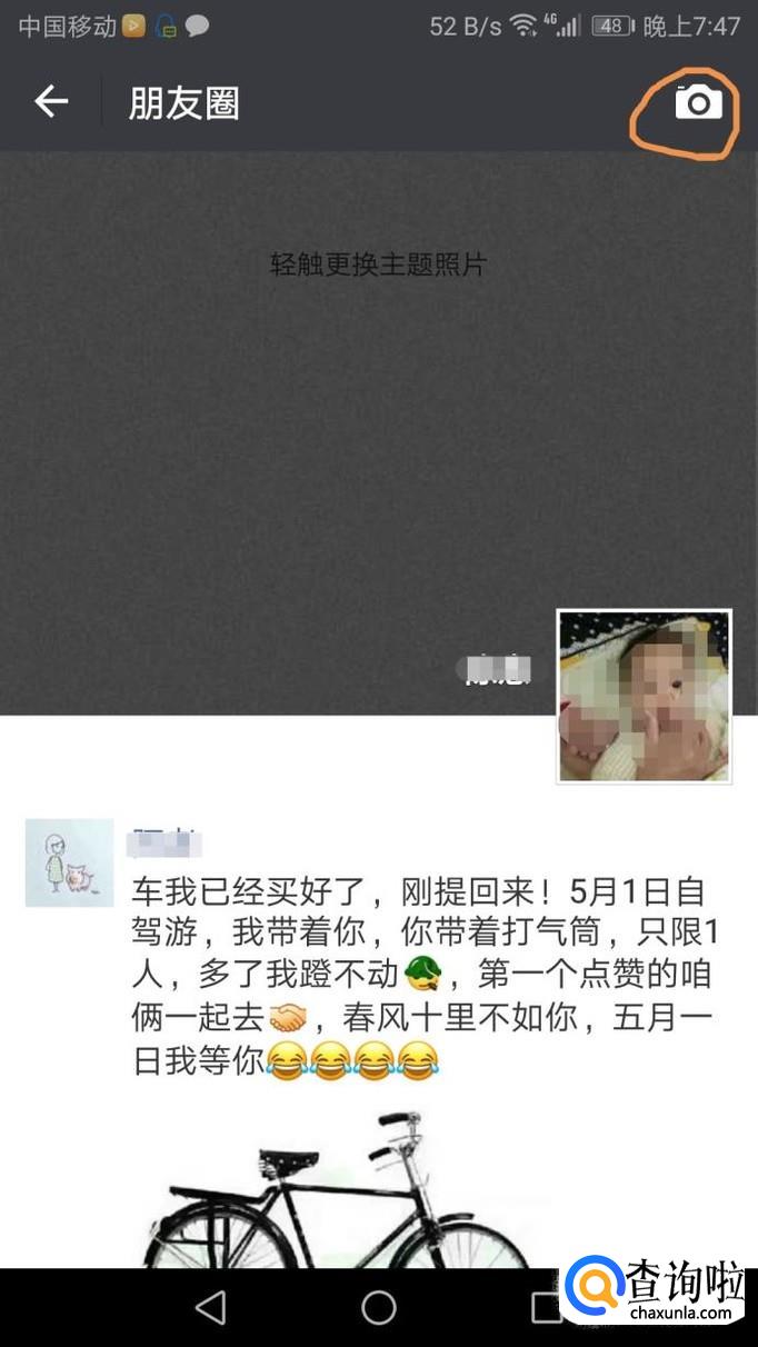 先打开微信朋友圈,点击右上角的“相机”按钮,在弹出来的框中点击“拍摄”。
