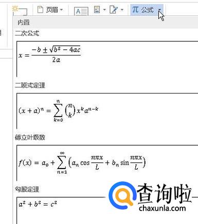看最右侧;在这里有“公式”按钮。点击其下拉按钮,弹出WORD内置的公式。