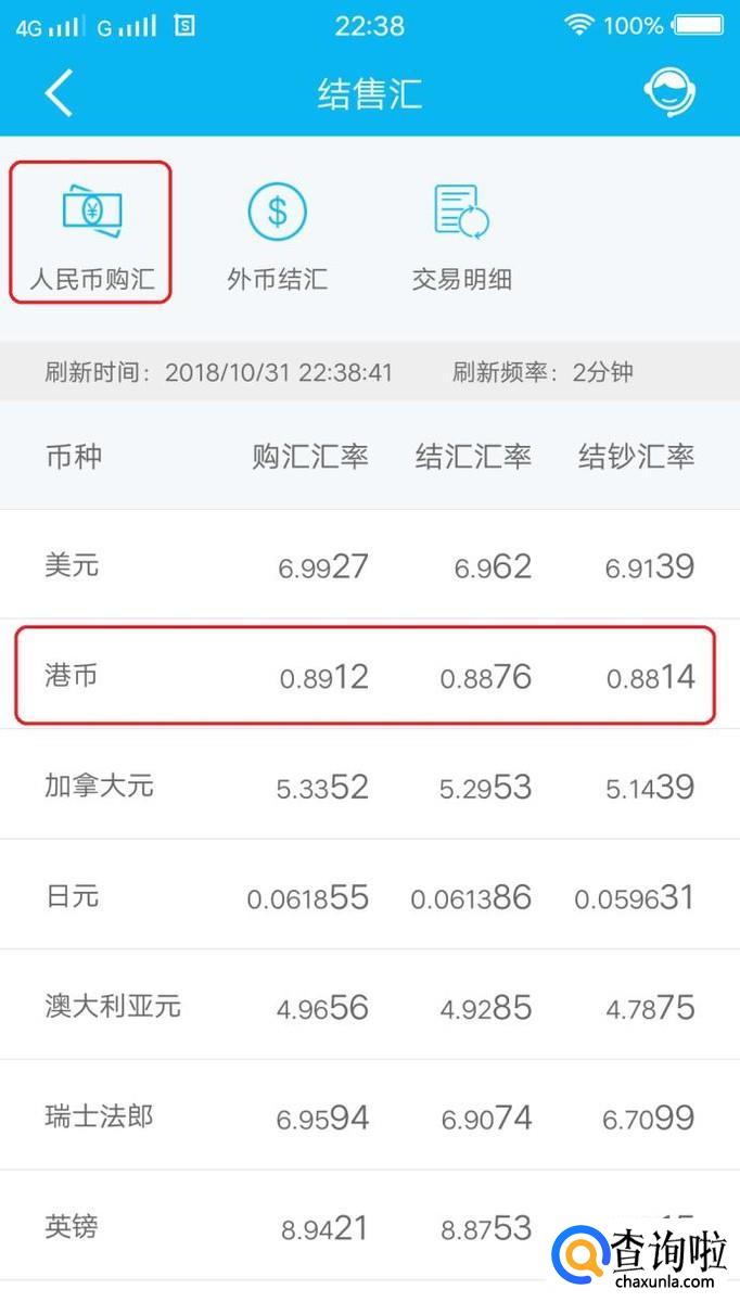 此时,就能看到港币的购汇汇率了,点击购汇即可。