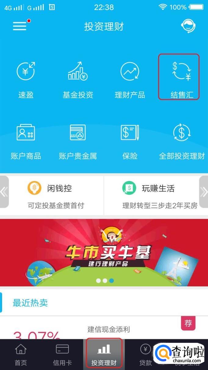 然后,我们点击下方“投资理财”,就能在页面中找到“结售汇”图标,我们点击一下。