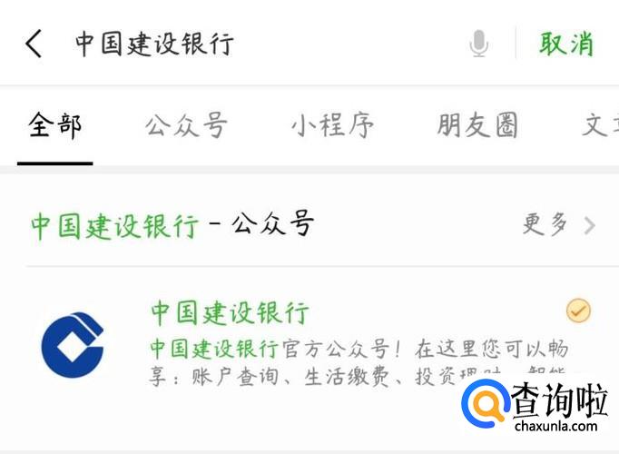 在微信搜索输入“中国建设银行”,查找公众号。公众号确实可以快速有效放心地解决顾客的问题,现下的微信公众号越来越收到消费者的青睐,并不是空穴来风。