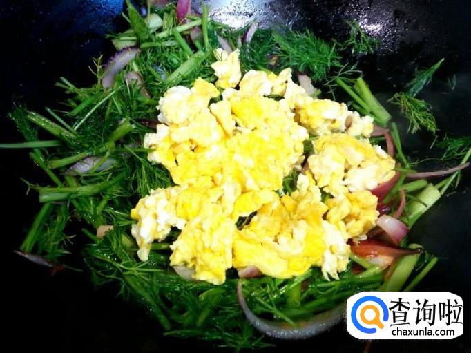 圆葱炒至六分熟,放入茴香翻炒,放入盐。炒至茴香变软,刚出亮光,放入炒好的鸡蛋。