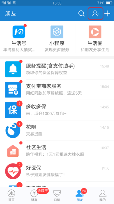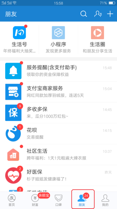一、手机打开支付宝进入后,找到“朋友”一项,点击进入。