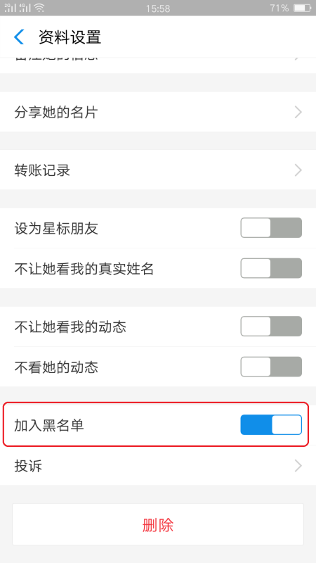 五、进入后找到“加入黑名单”一项,将这一栏的开关关闭即可将该联系人从黑名单里移除了。