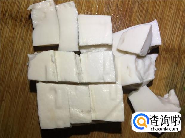 嫩豆腐放入盐水中泡一会,去除豆腥味,然后用刀子切成小块。
