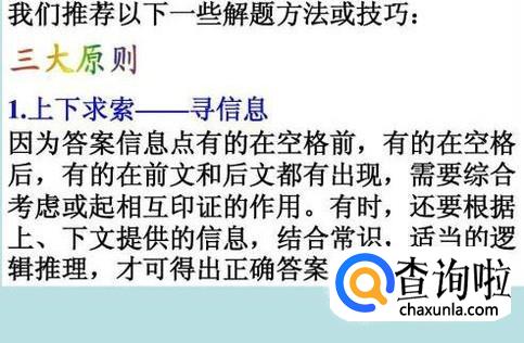 完形填空的技巧:第一,阅读第一句话,因为第一句是不挖空的,这段完整的话的目的就是告诉我们这篇文章讲的什么,千万不要阅读完整篇文章在做题,那是大神的做法,而且很费时间。阅读理解是整个高考英语中最难的题,我们要做的就是在最少的时间里做最多的题。所以我们直接边看边做边猜。这样只要有一定的英语基础的人都会有百分之六十到八十的正确率。当年我用这种方法完形填空只错了三个。