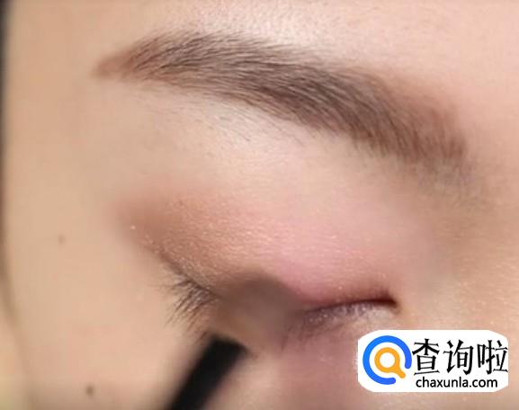 再用小号眼影刷蘸取棕色眼影,描画双眼皮褶皱,达到加深双眼皮的效果,塑造深邃大眼。