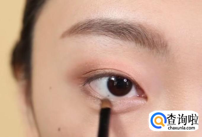 再换成小号眼影刷蘸取棕色眼影,描画下眼线,有放大眼睛的效果。