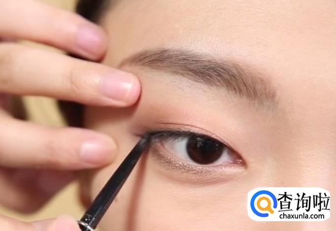 拿出棕色眼线胶笔,描画内眼线,拉长眼尾。
