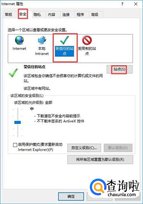 之后我们点击安全,然后点击受信任的站点,然后点击站点;