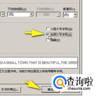 弹出字体的对话框。如下图箭头指的位置,点击一下,“全部大写字母”勾选。再点确定。