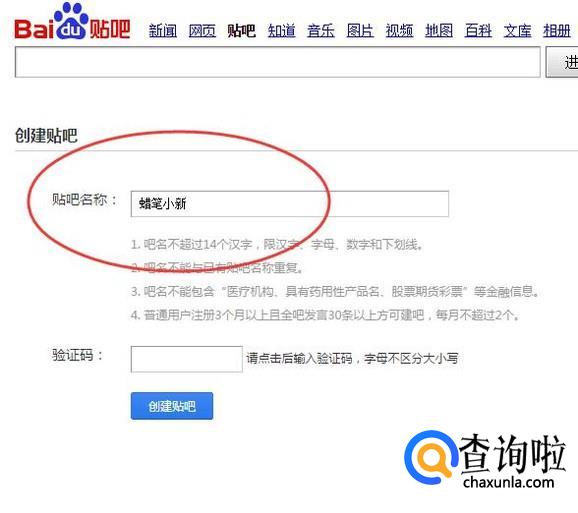 然后输入要创建的【贴吧名称】,比如【蜡笔小新】,如下图所示: