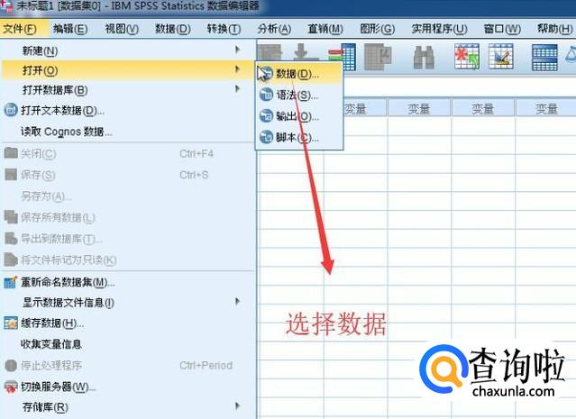首先我们点击SPSS软件的顶部文件菜单,选择下拉菜单中的数据选项,如下图所示