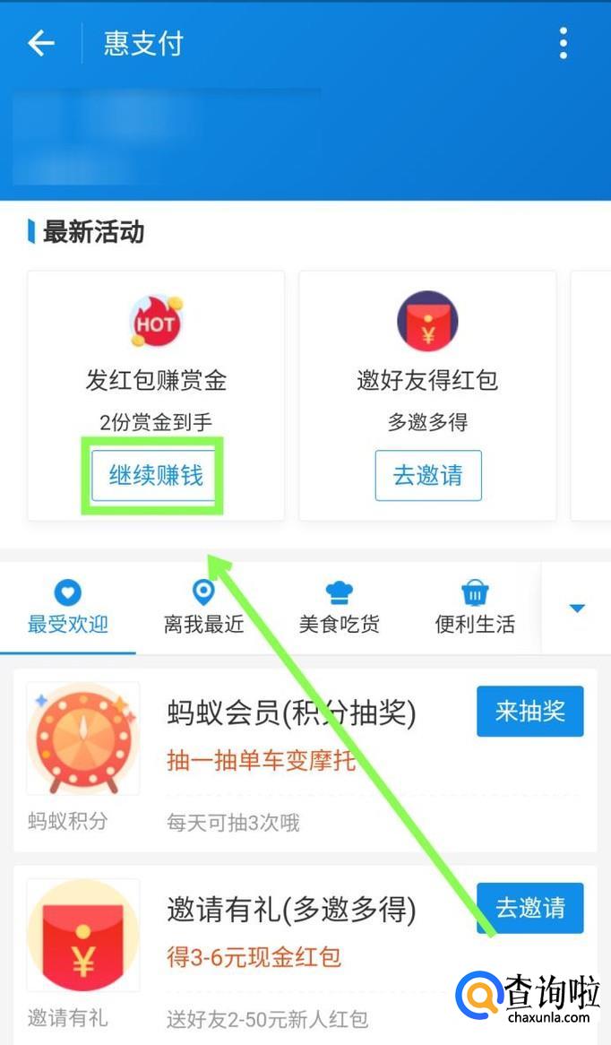 在”最新活动“里找到”发红包赚赏金“,点击”继续赚钱“。