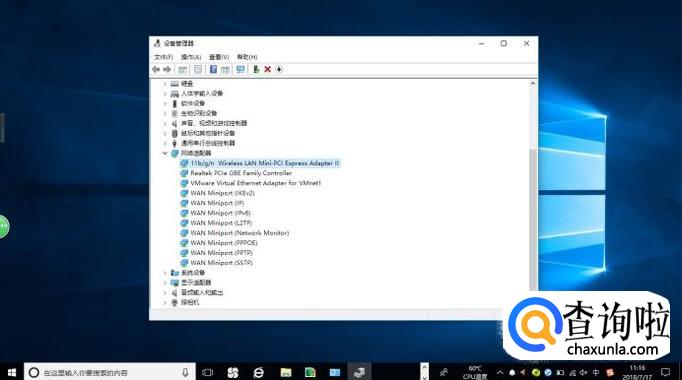 如图所示,唤出"设备管理器"程序窗口。展开左侧树形目录结构,点击"网络适配器"文件夹。