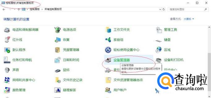 唤出"控制面板"程序窗口,如图所示。点击"设备管理器"图标,查看和更新设备硬件设置和驱动程序软件。
