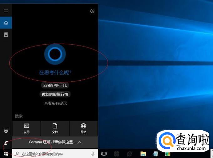 启动Windows 10操作系统,如图所示。点击任务栏搜索框,开始使用Cortana(小娜)智能语音助理。
