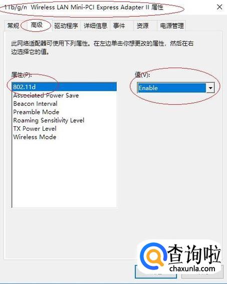 点击"属性→802.11d→值"右侧向下箭头,如图选择"Enable"项。本例到此结束,希望对大家能有所帮助。