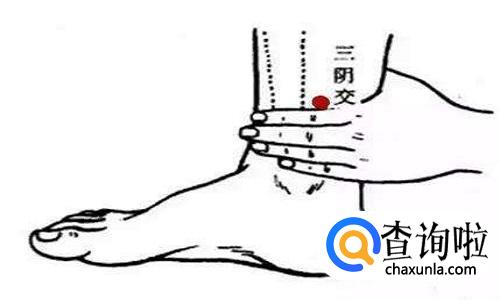 按摩方法:用拇指端着力,顺时针方向按揉三阴交约2分钟,然后逆时针方向按揉2分钟,以局部有酸胀感为佳。