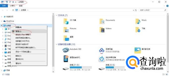 如图所示,单击鼠标右键。弹出快捷菜单,选择"管理"项。