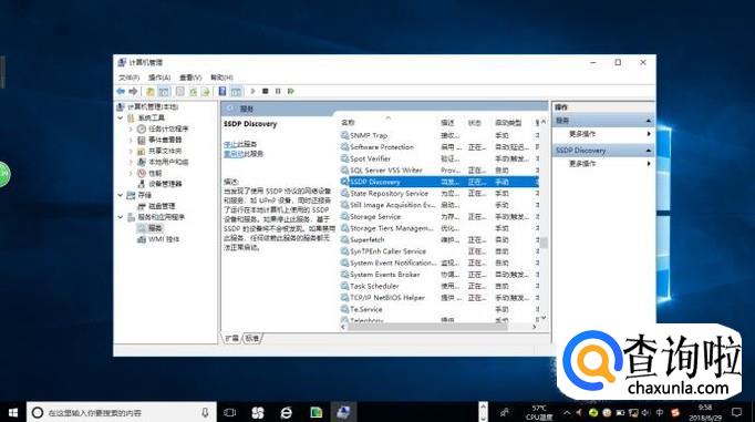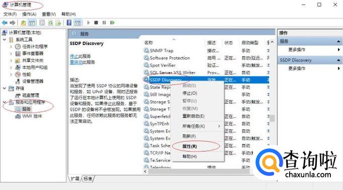 唤出"计算机管理"程序窗口,如图所示。鼠标右击"服务和应用程序→服务→SSDP Discover"服务,弹出快捷菜单选择"属性"项。