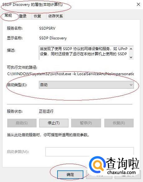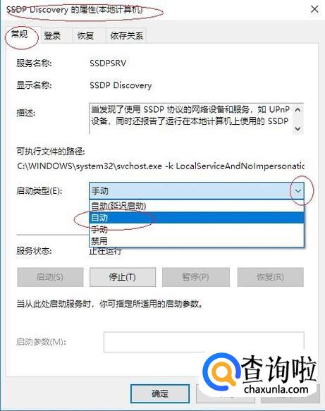 如图所示,弹出"服务属性"对话框。点击"常规→启动类型"文本框右侧向下箭头,弹出下拉列表选择"自动"项。