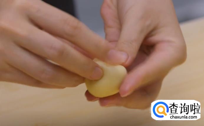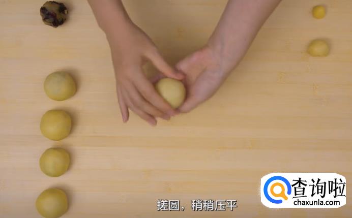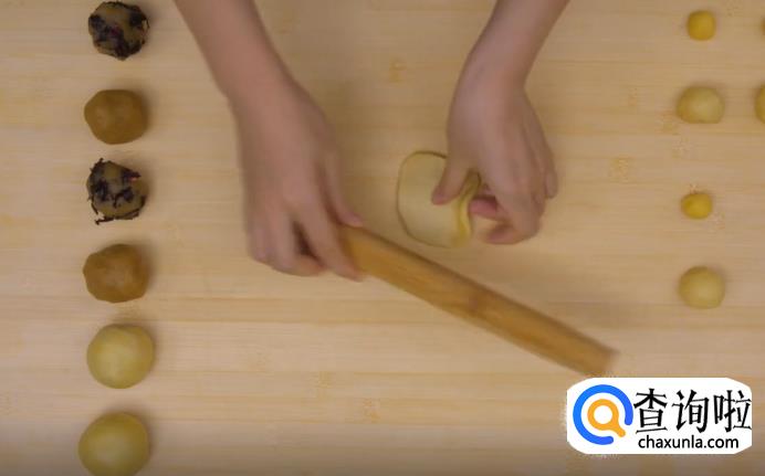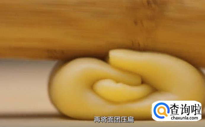最后制作成品,先手工开酥,水油面(18克)捏扁,包起油酥(6克),再用擀面杖将其擀平后卷起,然后叠三折,将面团压扁,擀成面皮。