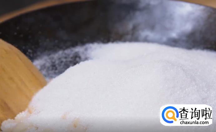煮好之后,将白芸豆倒入热铁锅中,加入白砂糖,一起炒制。