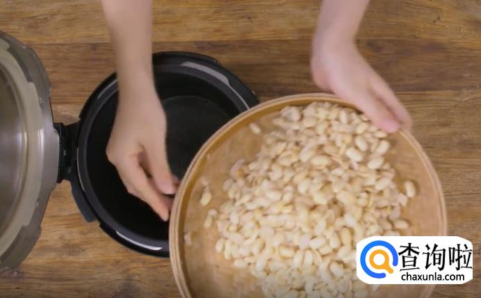 然后来制作两款馅料中都会用到的底料——白芸都茸。先把清水浸泡过夜的白芸豆撕去外皮,放入高压锅中,再倒入冷水,炖煮30分钟。