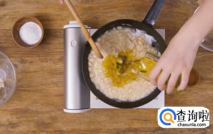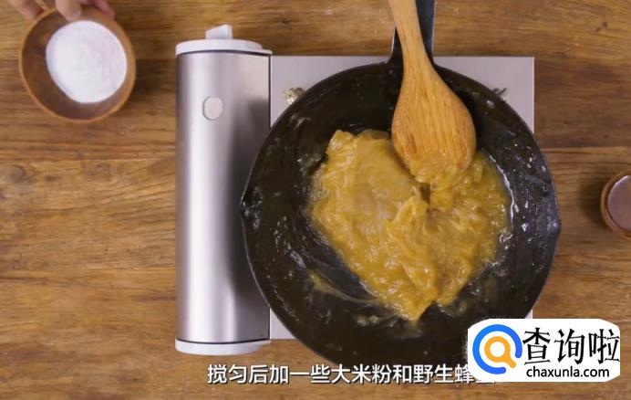 接着,翻炒之后加入橄榄油,搅匀后再加一些大米粉和野生蜂蜜,持续搅拌,煮至豆茸稠厚干硬。