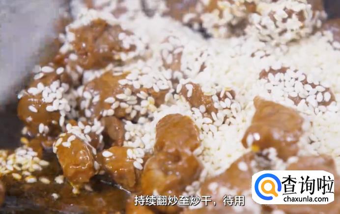 腌制好之后,将牛肉粒倒入热锅中翻炒,再加入白芝麻来增加香味,持续翻炒至炒干后捞出来待用。