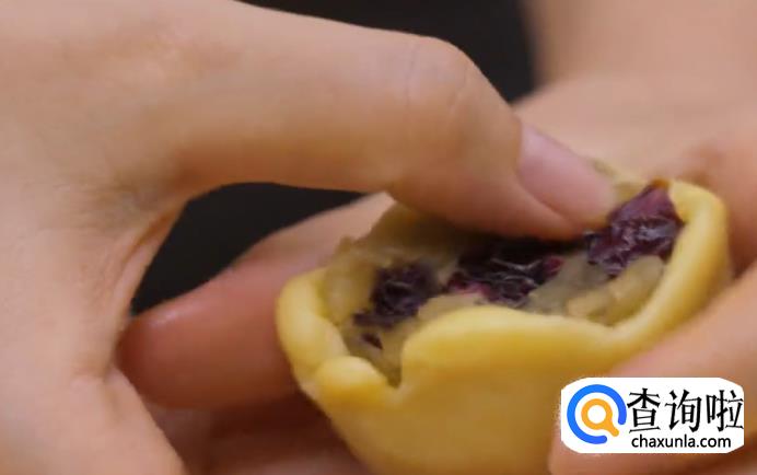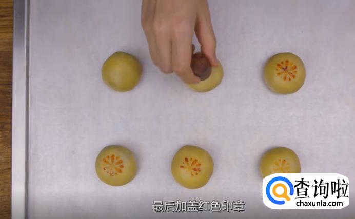 擀成面皮后,包入馅料,搓圆后稍稍压平,最后加盖红色印章。