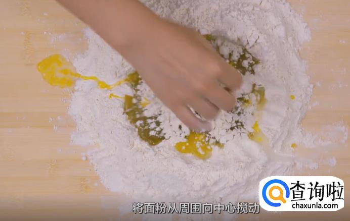 首先来制作饼皮,先做水油面,将面粉、白砂糖和橄榄油混合在一起,慢慢加一些水,把面粉从周围向中心搅动。