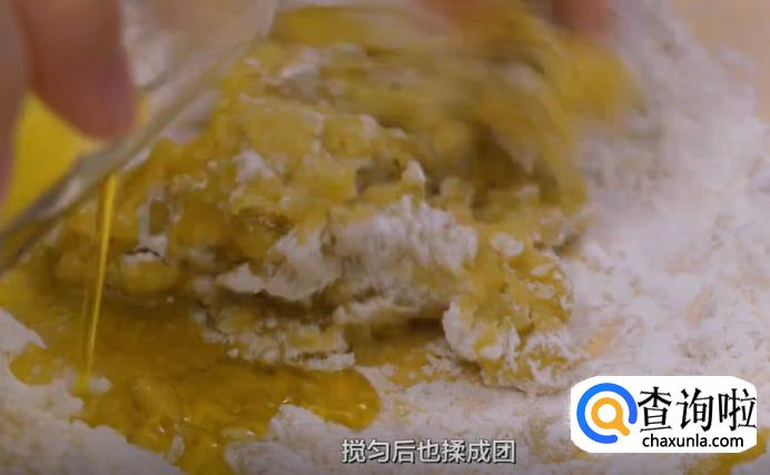 接着做油酥面,将橄榄油倒入面粉中,搅匀后也揉成团,同样用保鲜膜包裹好,放在一旁待用。
