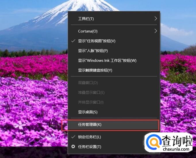首先,在桌面上将鼠标移动至任务栏击右键,选择“任务管理器”选项。