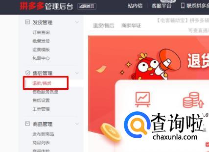 打开浏览器登陆拼多多商家平台,登陆成功后在左侧会看到“退款/售后”按钮。