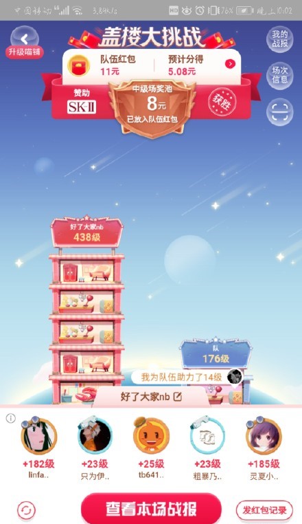 最多5位合伙人可以组成一支队伍参与盖楼大挑战,按照两队的队伍高楼总等级高低来衡量胜负,队伍的高楼总等级可通过队员上线助力、拉人助力等方式提升。