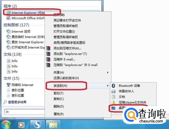 右键点击搜索到的IE图标,选择“发送到”,“桌面快捷方式”。