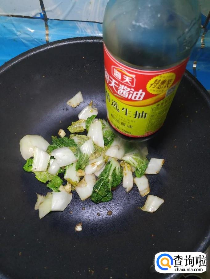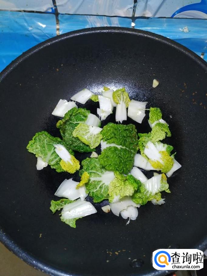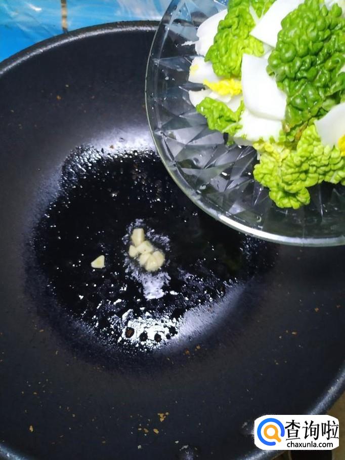炒锅中再加入少许油,加入适量蒜炒香,然后将乌塌菜倒入锅中,翻炒均匀。