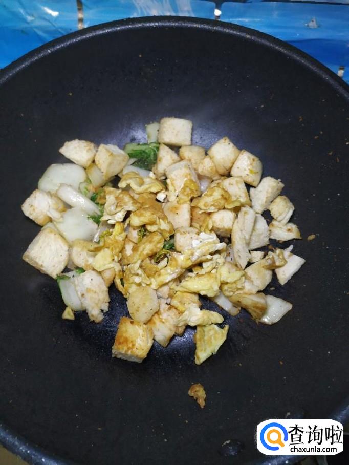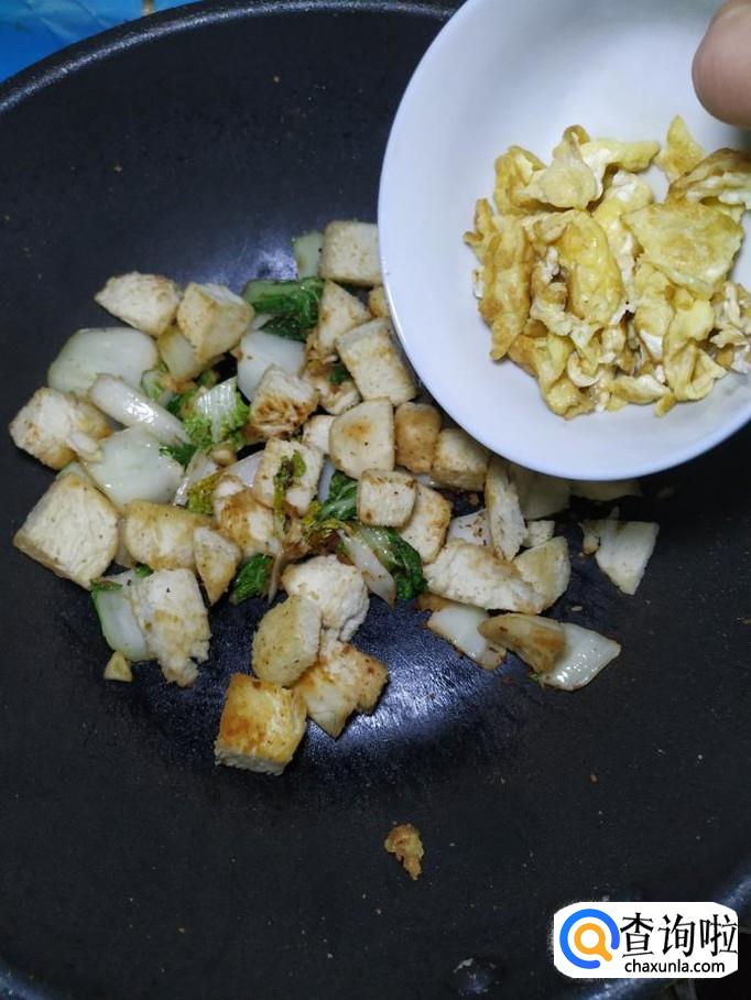将之前炒好的馒头块倒入锅中,然后将炒好的鸡蛋也倒入锅中,翻炒均匀。