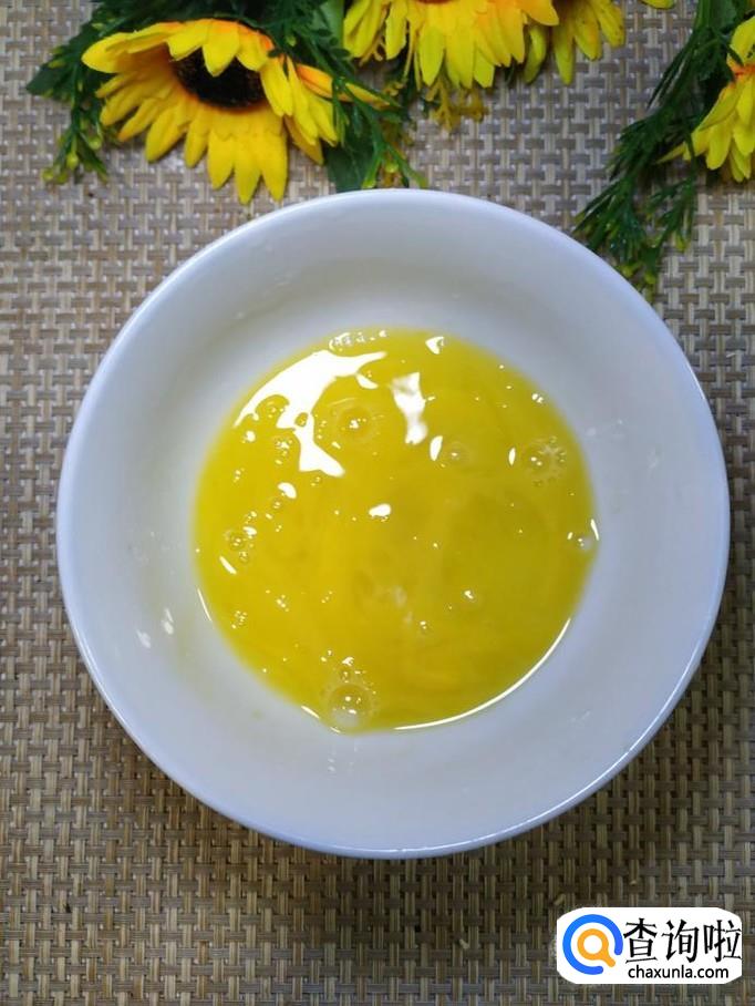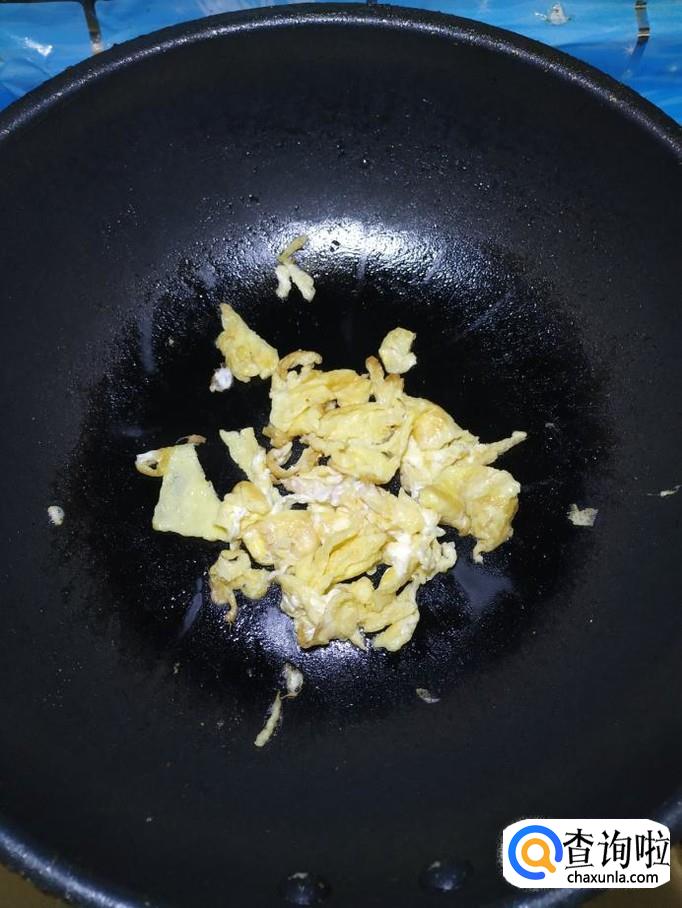 碗中打入一个鸡蛋,加少许盐打散,炒锅中放入适量油,油热后将鸡蛋放入,炒熟,盛出备用。