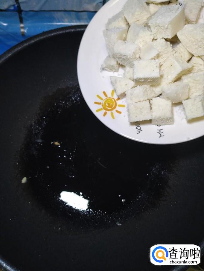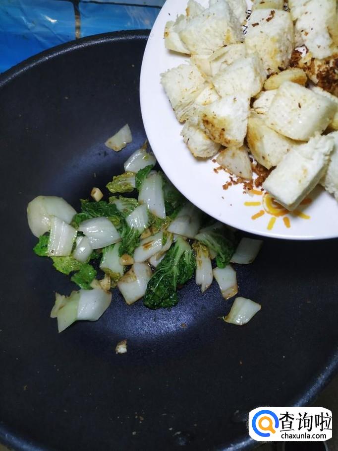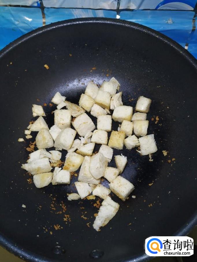 炒锅中再加入少许油,将馒头块儿,倒入锅中,翻炒至表面微微变色,盛出备用。