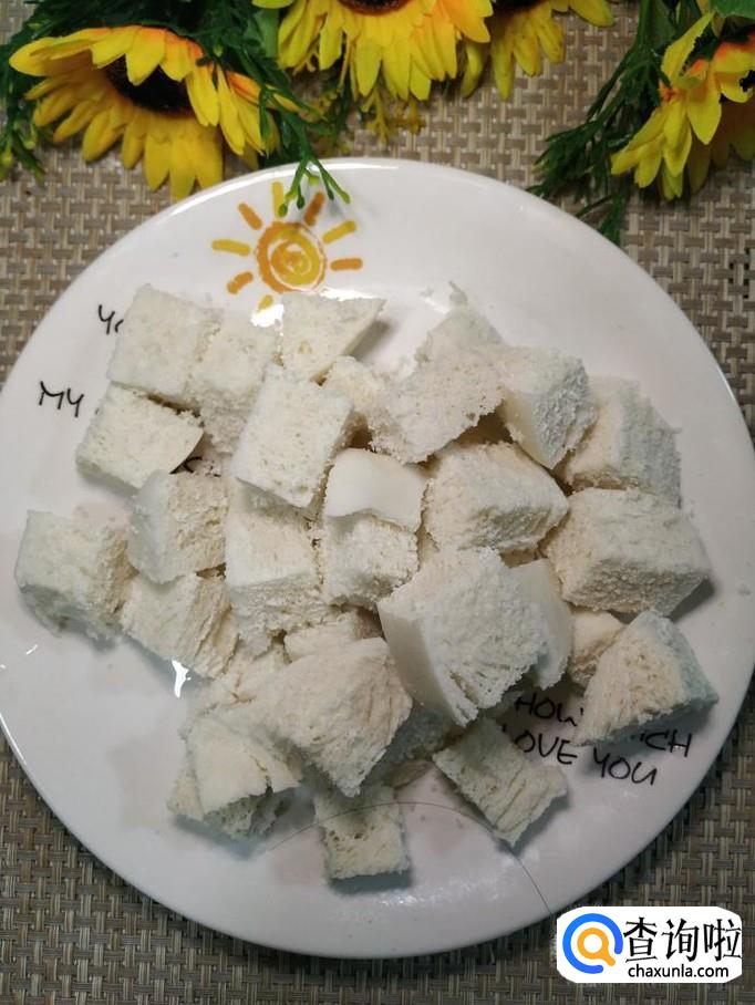 准备一个吃剩的馒头,切成大方块,放入盘中备用。