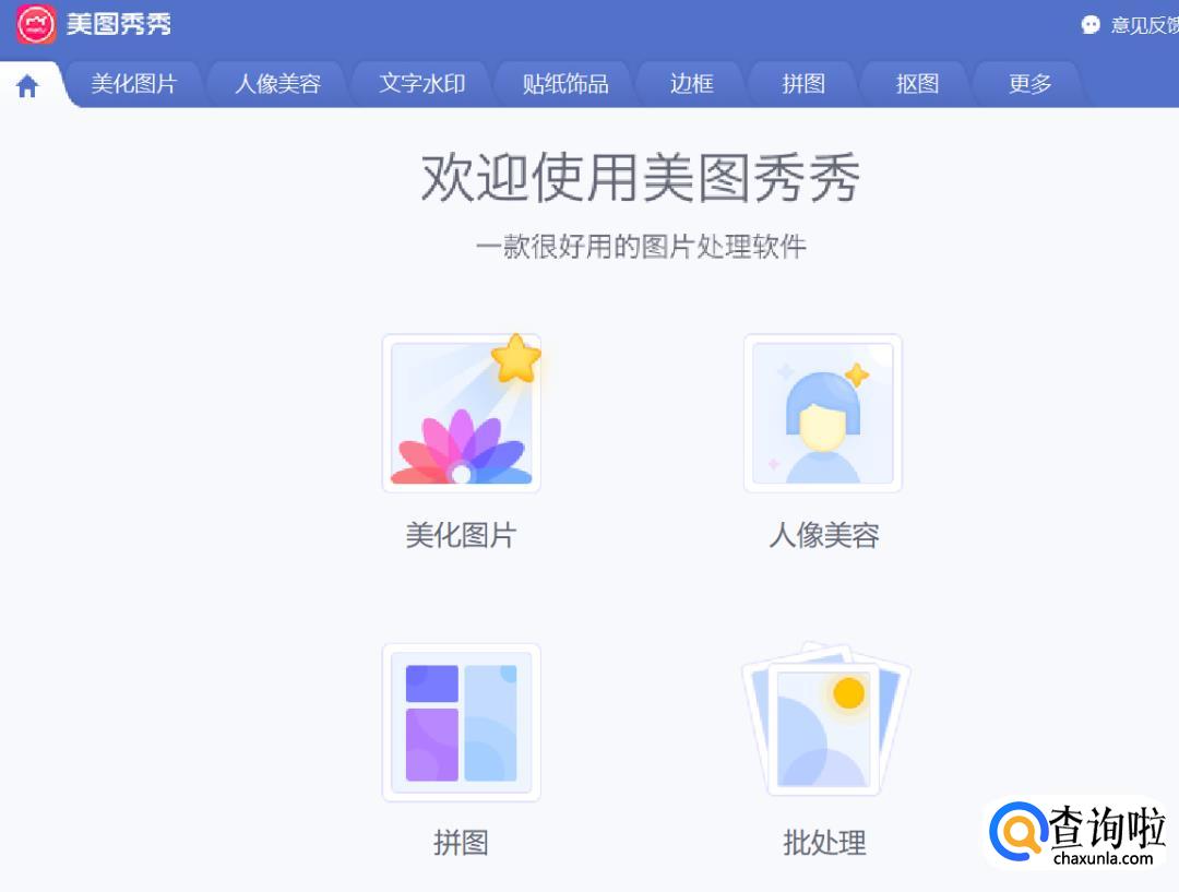 点击打开美图秀秀,我们可以看到有“美化图片”、“人像美容”、“拼图”、“批处理”,点击美化图片。进入以后选择打开图片,打开我们需要美化的一张图片。