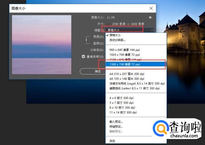 接下来,在打开的页面中选择“调整”选项,在下拉列表中调整图像分辨率,可以选择调整为比原始图片分辨率小一些即可。