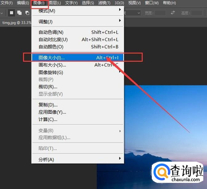 首先,请大家使用Photoshop软件打开需要进行压缩处理的图片文件,然后点击“图像-图像大小”菜单选项。