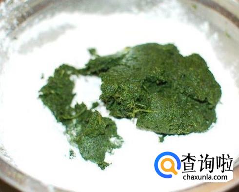 把艾草放入炸汁机炸成糊状,再加入糯米粉盆里,用筷子搅拌成面疙瘩,再和成光滑的面团。